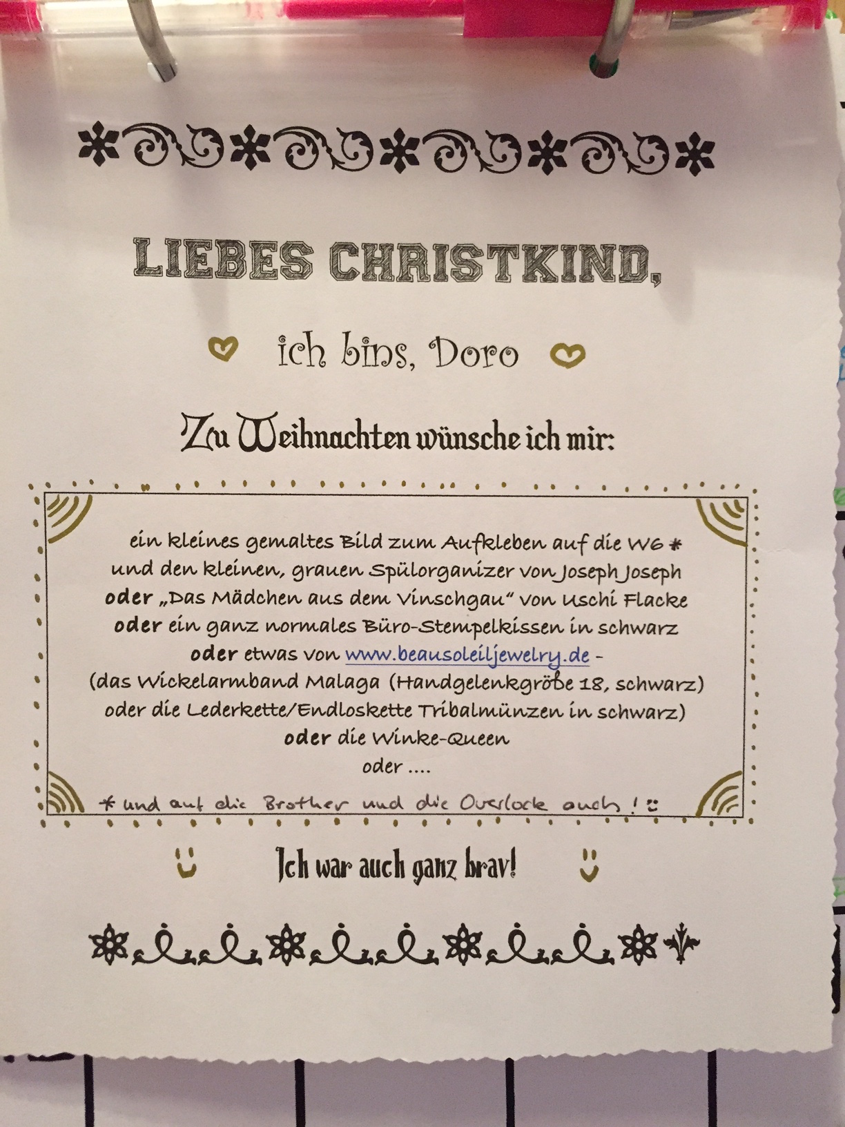 Dieses Jahr habe ich übrigens beschlossen, den Stresspegel von Mann und Kind auch ein bißchen zu senken, indem ICH auch einen Wunschzettel geschrieben habe. Ha!