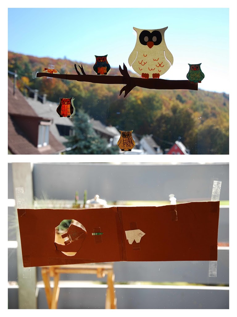 Mehrfach putzige Eulen ausgedruckt, bemalt und ausgeschnitten. Zweig entworfen von Sohn #1. Man beachte das kleine Tier, welches sich ganz links auf dem Ast befindet. *Kreisch* Ein Eichhörnchen! Unten das ganz ohne Mama gebastelte Fensterbild: Erde mit einer Höhle drin, und in der Höhle ein Siebenschläfer und in der Erde noch ein Wurm und ein Maulwurf und auf der Erde ein Fliegenpilz. Kihihihi, wie schnuffig!!