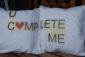 Um unseren ganz persönlichen Valentines Day ein bißchen netter zu machen und weil mir die Idee so gut gefiel (Danke an Doris für die Verlinkung!) wollte ich statt eines Geschenkes (Rasierwasser, Kinogutschein, gääähn) die Kissenbezüge nachmachen. Die Shirts fand ich ja NOCH schöner, aber Achtung: Falle! T-Shirts sind aus Jerseystoff und Jersey und ich… man weiß ja wie das endet. Also dachte ich mir, ein fester Baumwollstoff wird mir doch nicht unterm Bügeleisen wegrutschen, das dürfte doch selbst ich mit meinen bescheidenen Fähigkeiten hinkriegen.
