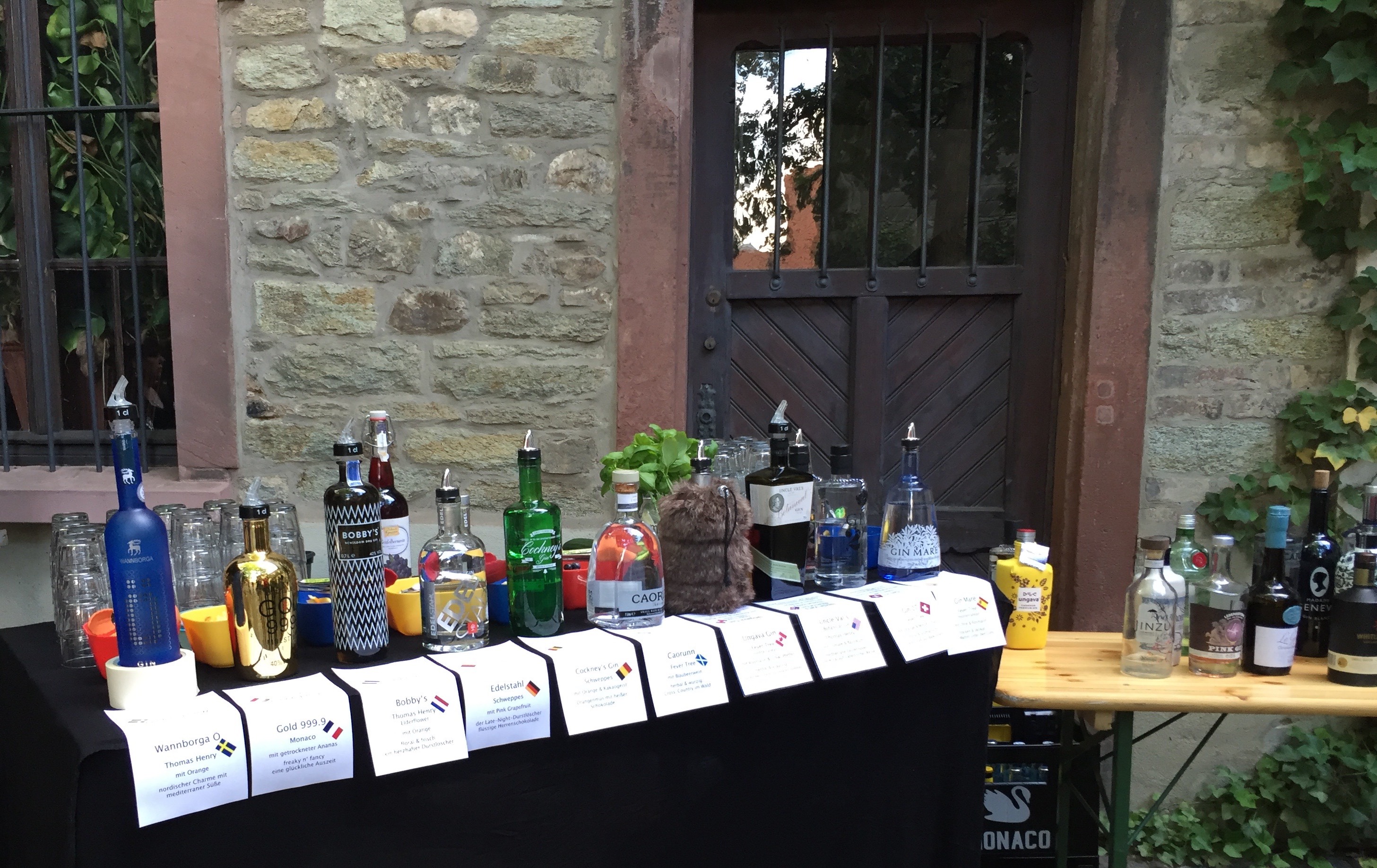 Ich musste mir also was eigenes suchen, wofür ich mein Doppeljobgehalt sinnlos zum Fenster rauswerfen kann. Da fiel mir der Gin Tonic wieder ein, den wir in Singapur des öfteren geschlürft hatten, der war hier bislang immer nur recht halbherzig aus Gordons Dry und Schweppes zusammengemixt- das sollte doch noch aufzuwerten sein, daher wurde im Sommer erstmal zusammen mit der Ginfreundin ein Gin-Tasting bei der Volkshochschule gebucht.